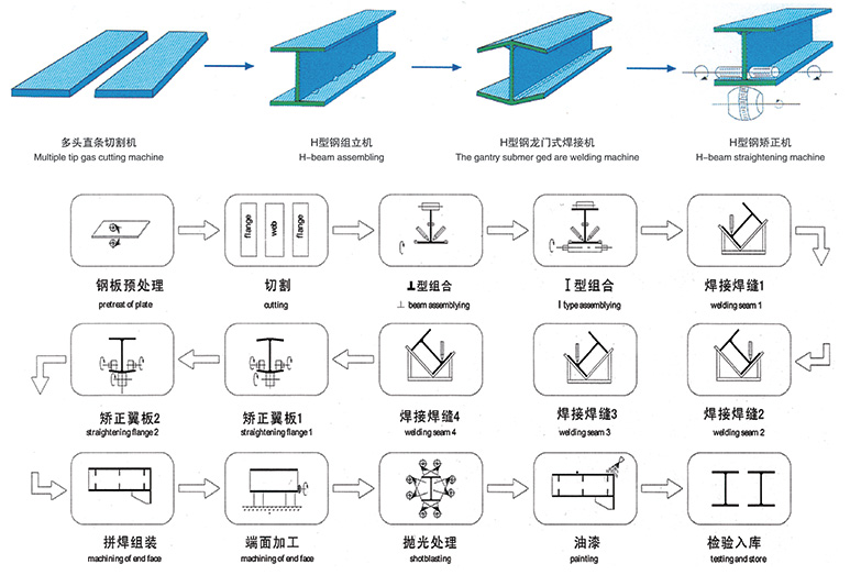 该生产线由数控切割机、H型钢自动组立机、H型钢龙门式自动焊接机或双悬臂自动焊接机、H型钢翼缘矫正机、H型钢抛丸机等主要设备组成。生产工艺上为单机独立操作,工件转运靠起重机吊运,整线比较灵活,可在不同的工艺段添加设备,以提高生产效率。